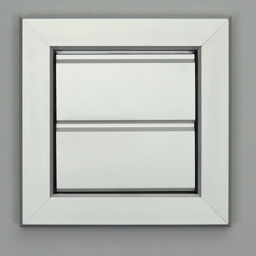 Overdrukrooster vervaardigd van aluminium extrusieprofielen, opbouw. Dit rooster heeft beweegbare lamellen welke zich bij overdruk openen.