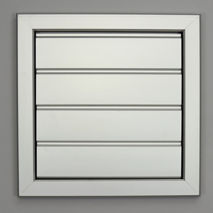 Overdrukrooster vervaardigd van aluminium extrusieprofielen, opbouw. Dit rooster heeft beweegbare lamellen welke zich bij overdruk openen.