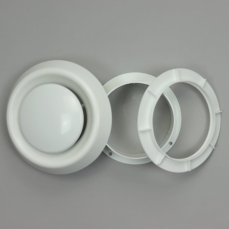 Instelbaar afzuigventiel, geschikt voor afzuigen van ventilatiesystemen met een relatief lage drukval. De aerodynamisch gevormde conus kan in of uitgedraaid worden om de juiste drukval en volumestroom in te stellen. De conus wordt hierna vastgezet door middel van een moer. De schuimrubber afdichting voorkomt vervuiling van plafond en muren. Voorzien van stalen klemveren voor een eenvoudige en snelle montage.
