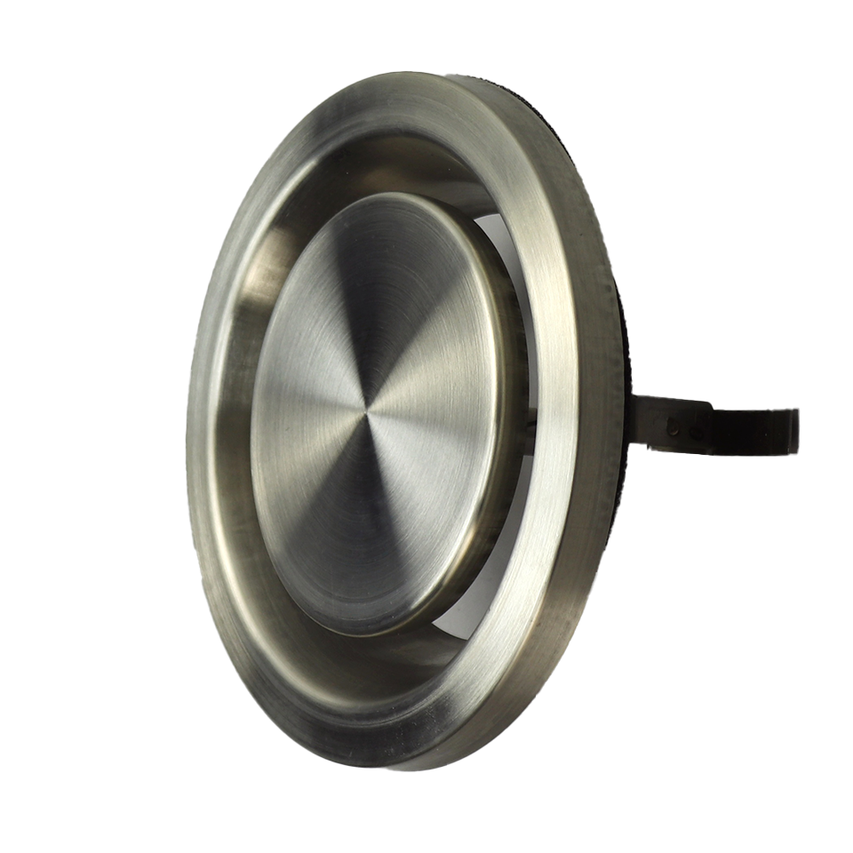 Instelbaar afvoerventiel, uitgevoerd in RVS 304. Fraaie vormgeving, robuuste uitvoering. Rond model, voorzien van stalen klemveren voor eenvoudige en snelle montage De conus kan traploos in of uitgedraaid worden om de juiste drukval en volumestroom in te stellen. De conus wordt hierna vastgezet door middel van een moer. De schuimrubber afdichting voorkomt vervuiling van plafond en muren. Voorzien van stalen klemveren voor een eenvoudige en snelle montage.
