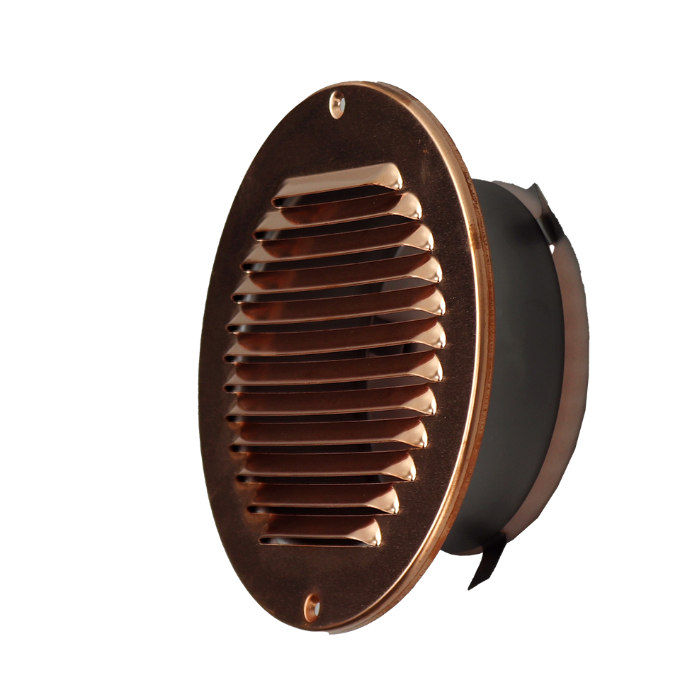 Schoepenrooster met omgezette rand, uitgevoerd in koper. Fraaie vormgeving passend bij vele architectuur stijlen. Rond model, voorzien van een rvs buisaansluiting met rvs klemveren voor eenvoudige en snelle montage (bevestiging met schroeven is ook mogelijk).